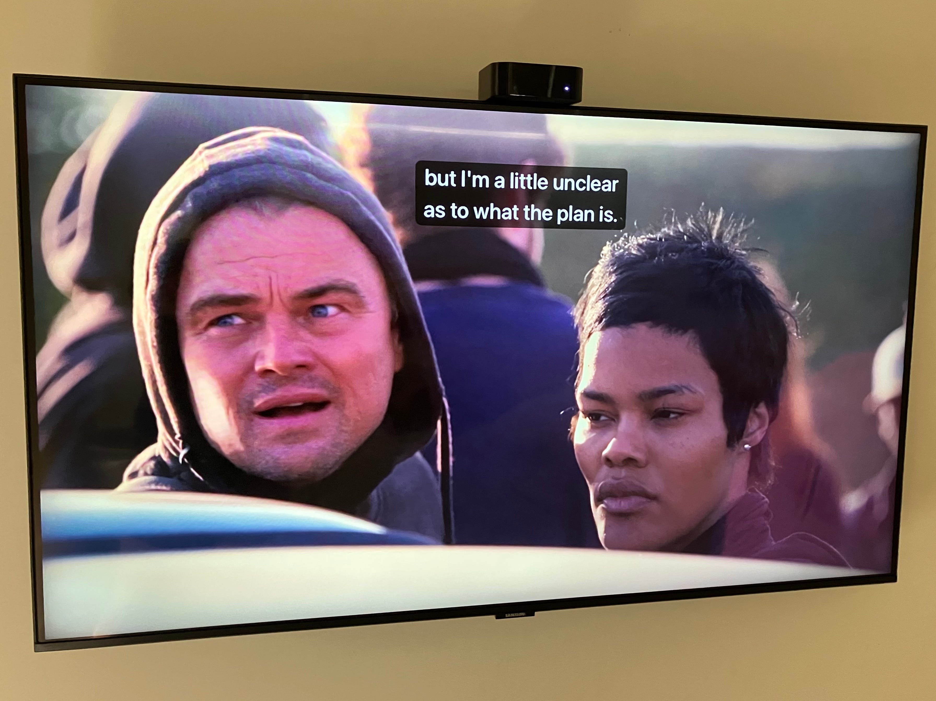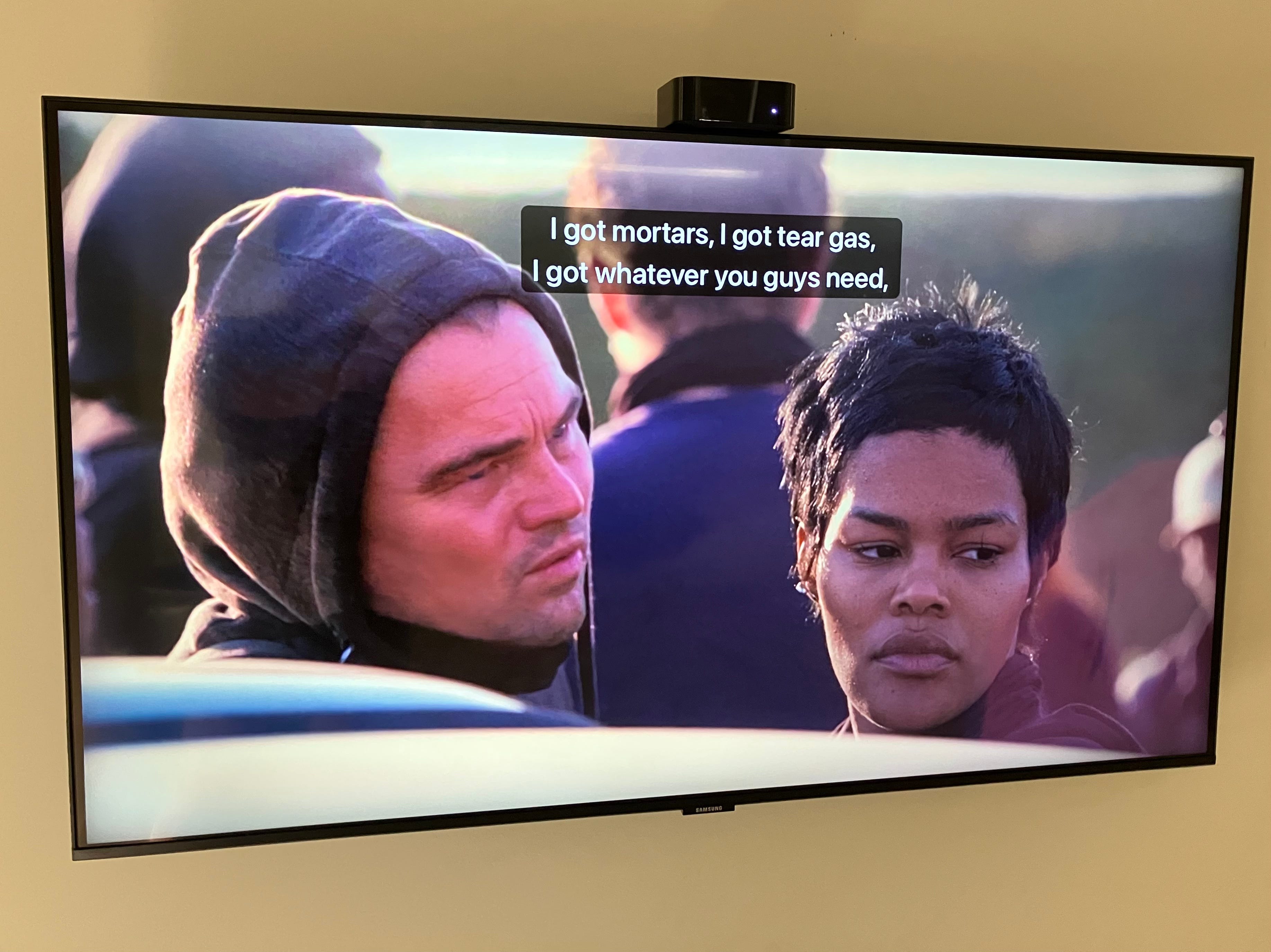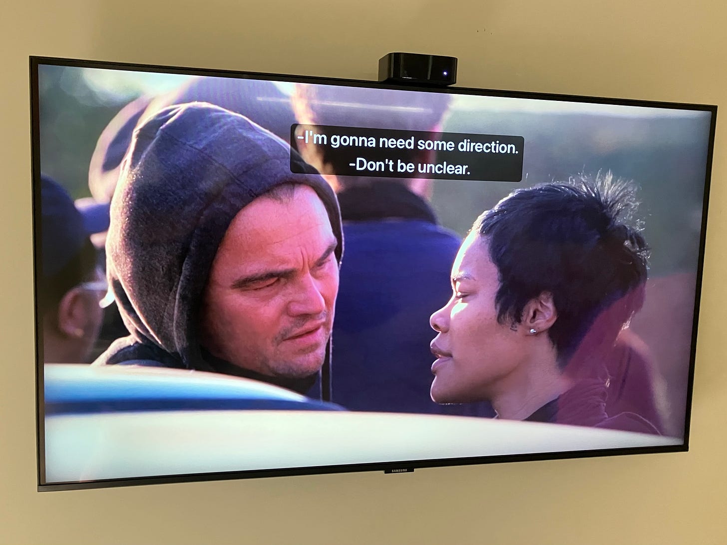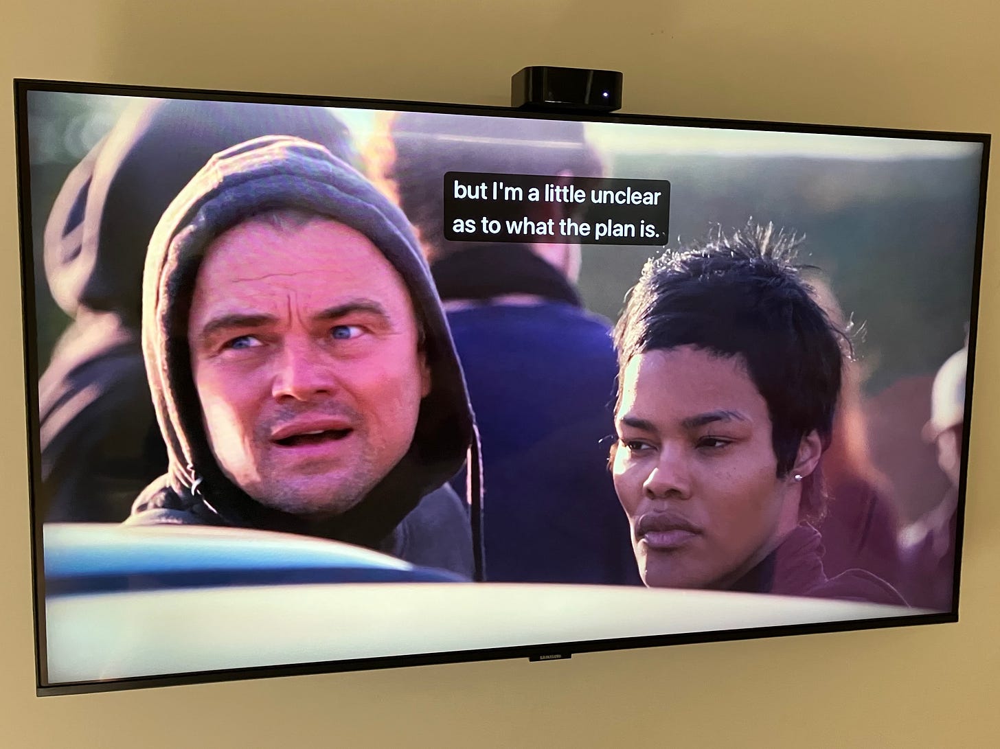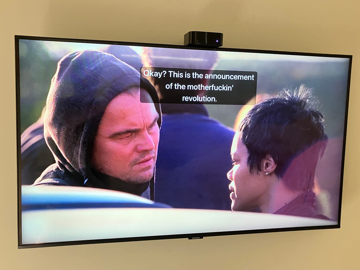 Don’t worry, I’m not going to take you scene by scene through this entire movie via photos of our TV screen. If you haven’t seen One Battle After Another, however, I do highly recommend it. I found it stunning and beautiful. A fun, borderline-joyous film about revolutionaries and white supremacists! I could’ve done without the very last scenes, but that’s for another essay and one I don’t want to write, at least not today.